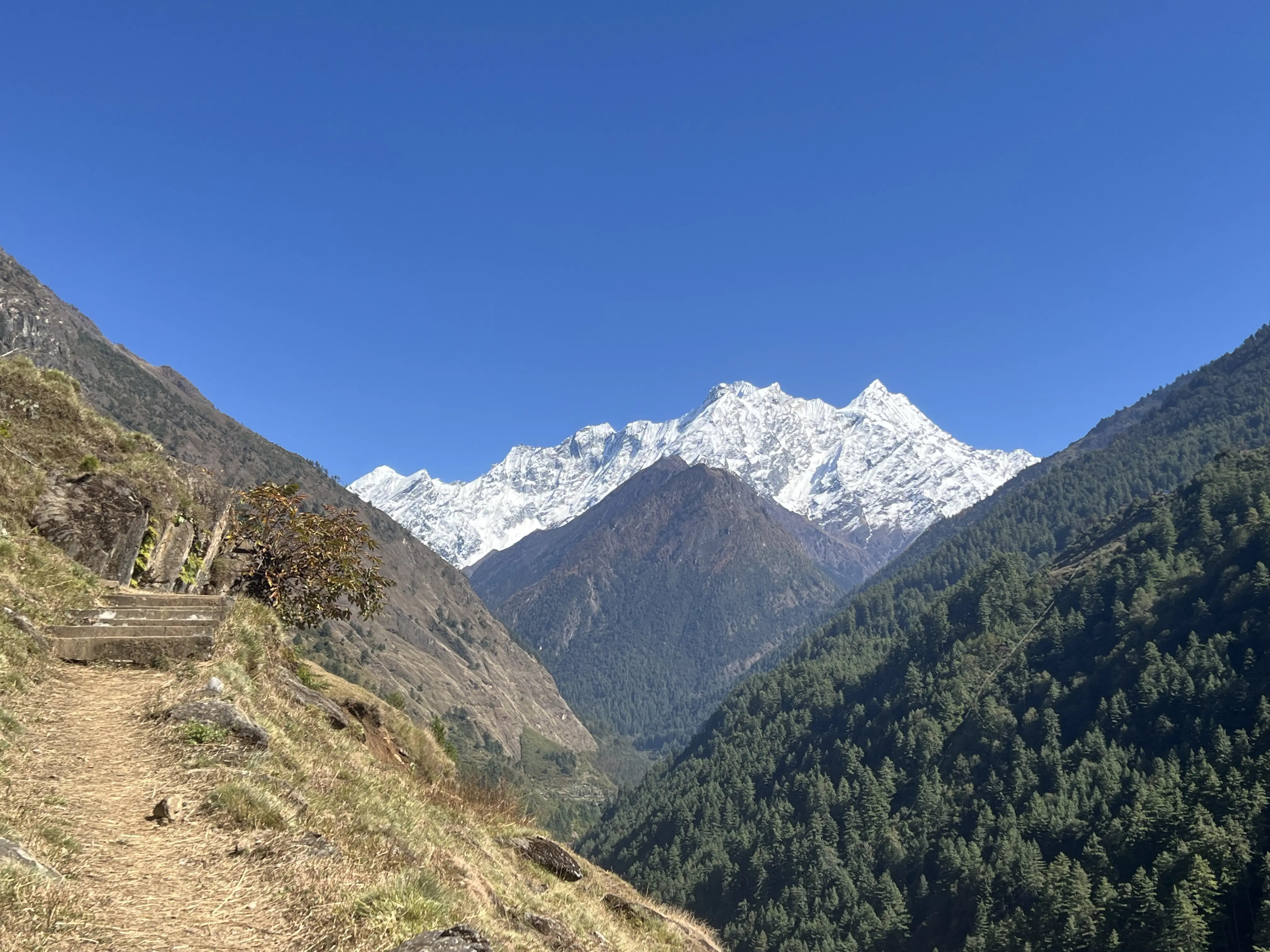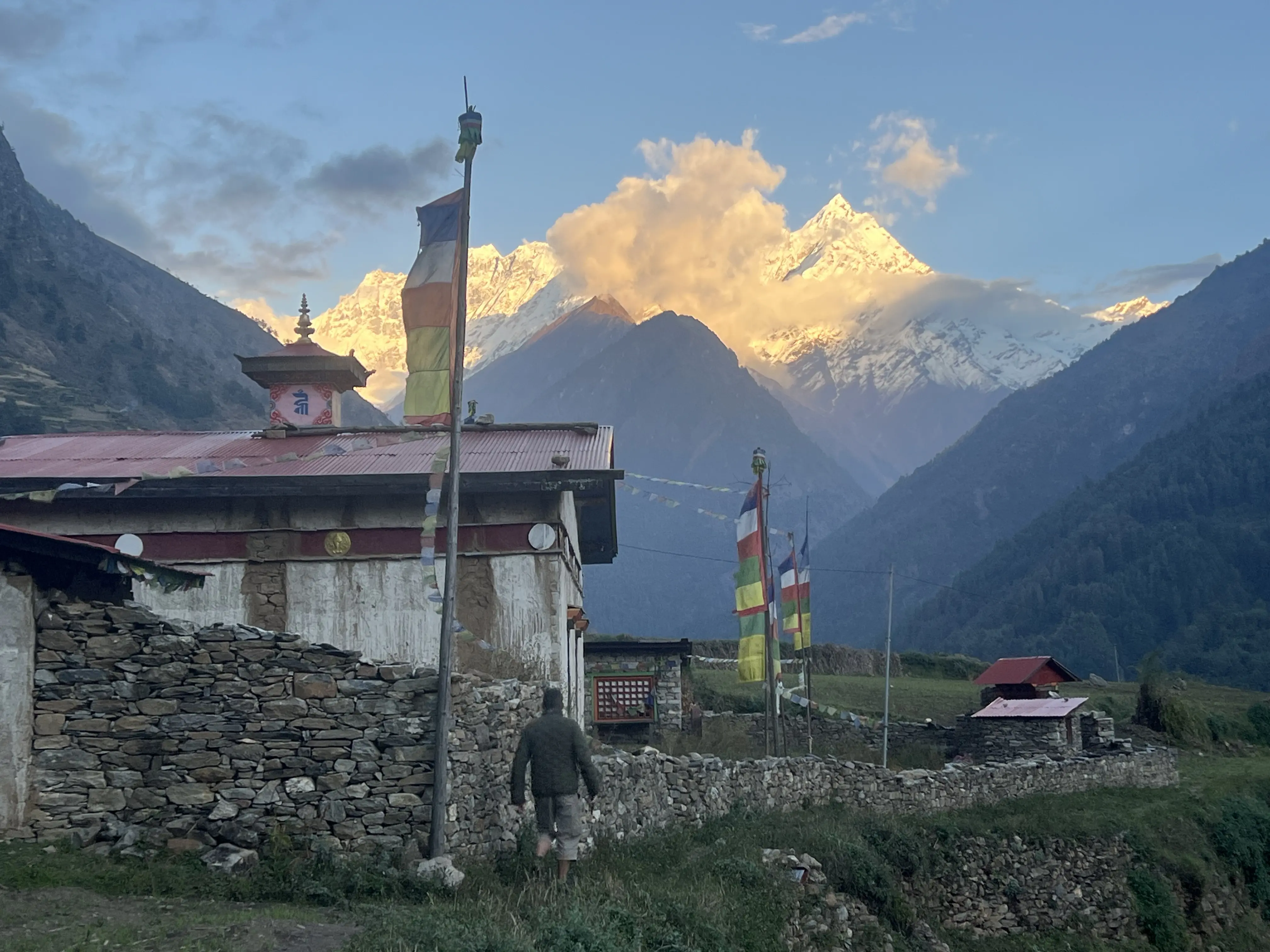 Deng is more of a peaceful overnight stop than a bustling village, with a few local homes scattered above a small stream. The views of Mt. Lachung and Chachung alongside the Budhi Gandaki River create a stunning backdrop.